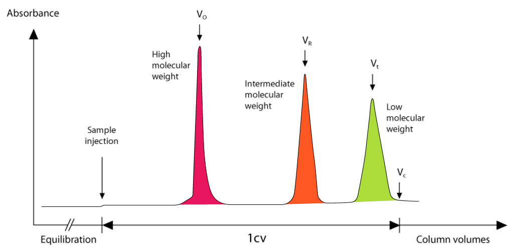 Pour cette technique, les molécules sont discriminées en fonction de leur taille. L’ordre d’élution est inversement proportionnel au rayon hydrodynamique des protéines, les molécules les plus volumineuses sont donc exclues en premier. La résine chromatographique polymérique, sur base silice ou agarose, est traitée de telle sorte qu’elle ne présente aucune interaction avec les molécules à séparer. De ce fait, l’élution est strictement isocratique.