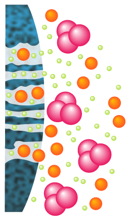 | pH moins acide. Une protéine chargée négativement (bleu) inter-agit avec une résine anionique et peut être isolée. Alternativement, les autres protéines peuvent être séparées sur une résine cationique alors que la protéine bleue n’est pas retenue. | pH moins basique. Une protéine chargée positivement (rouge) inter-agit avec une résine cationique et peut être isolée. Alternativement, les autres protéines peuvent être séparées sur une résine anionique alors que la protéine rouge n’est pas retenue. | |