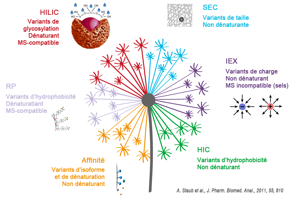 | Elution de tous les mAbs (pI entre 6.7 et 9.1), Il est possible de quantifier l’hétérogénéité des mABs et les quantités de variants acide/base S. Fekete et al., J. Pharm. Biomed. Anal., 2015, 102, 33-44 |