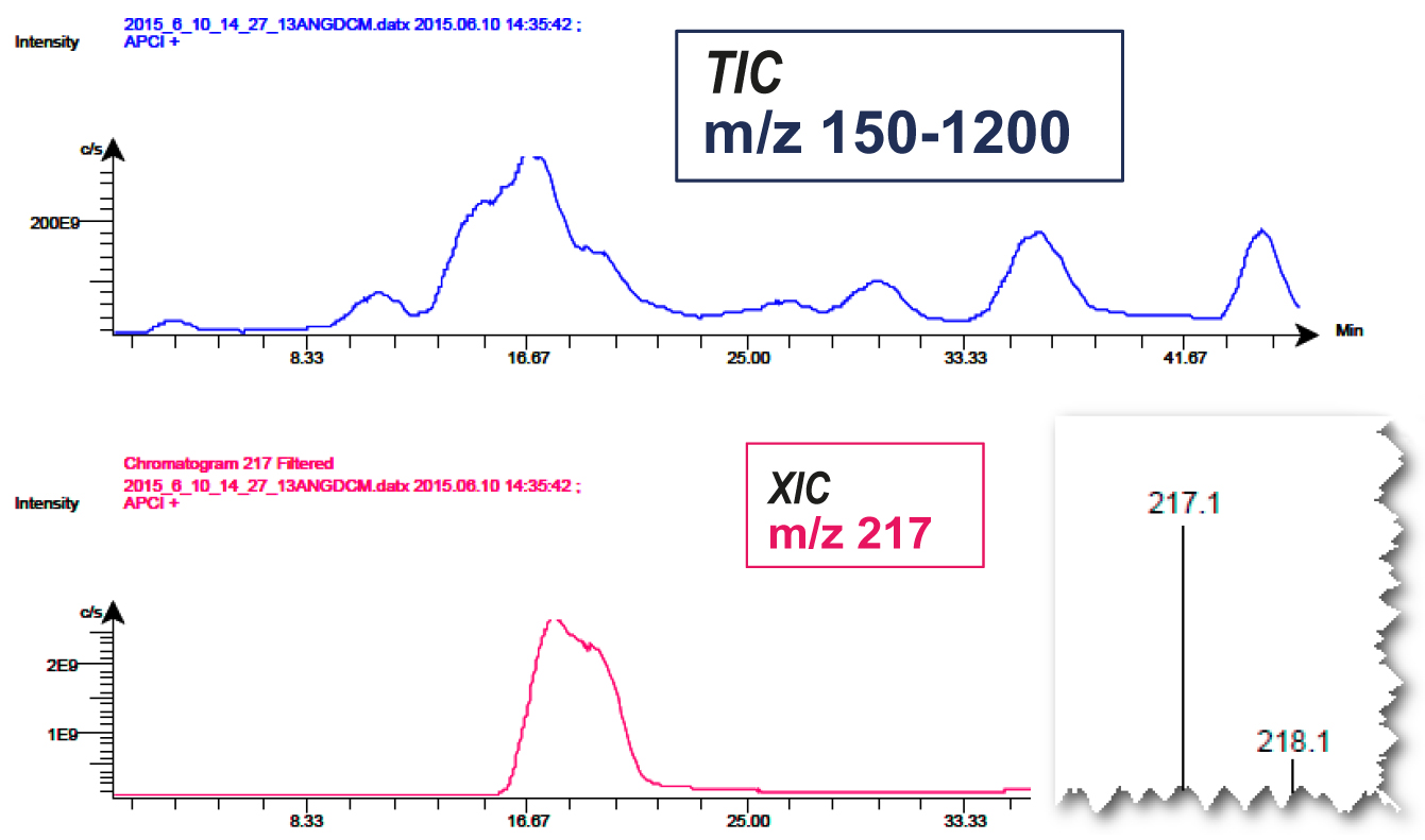 | La détection MS-ELSD en complément de la détection UV a permis de contrôler les métabolites secondaires sans ou avec peu de chromophores et la sélectivité de la MS a été d’une grande aide pour une collection précise des composés partiellement co-élués Fonction de la collection du déclenchement de la masse XIC. |