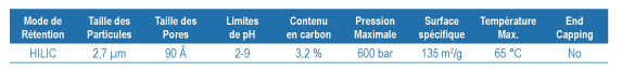 - La silice fused-core utilisée présente une surface spécifique de 135 m²/g et une porosité de 90 Å. Ce matériel très performant est spécifiquement dédié aux analyses et séparations des oligosaccharides et également et essentiellement aux protéines-Glycans par chromatographie HILIC (Hydrophilic Interactive LIquid Chromatography).