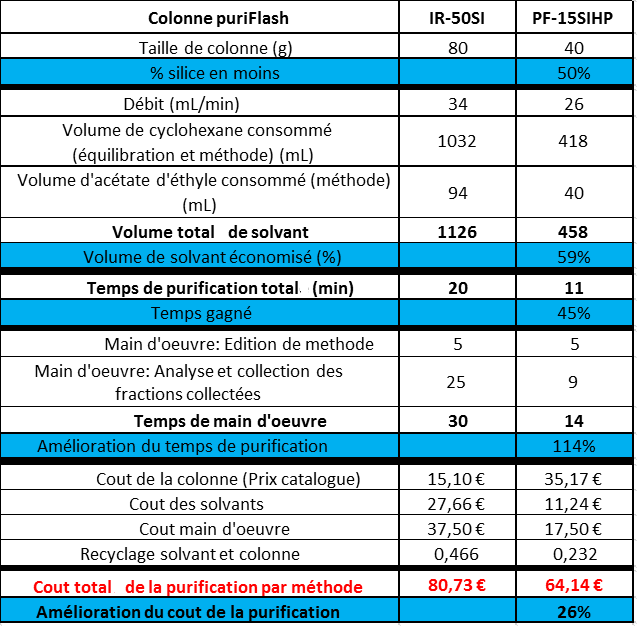 Utiliser une colonne 15µSIHP réduit le temps de rétention de 45%, le temps de manipulation des fractions (évaporation etc…) de 114%, la consommation de solvant de 59% et réduit de 26% le cout total de la purification. Un volume de collecte plus faible a pour conséquence un temps d’évaporation moindre.