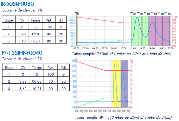 La colonne 15µSIHP-F0040 donne de meilleurs résultats avec une meilleure résolution, efficacité, capacité de charge, et de meilleurs temps de rétention comparé à une colonne IR-50SI.
