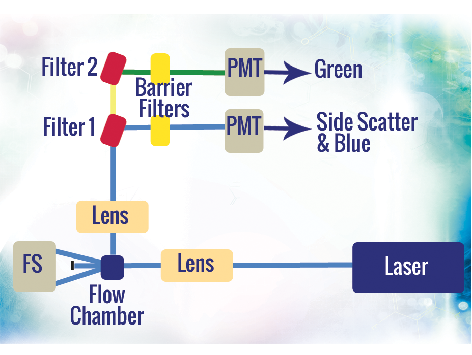Dans cet exemple, la source lumineuse est un laser de couleur bleue qui est concentré grâce à une lentille de focalisation avant de pénétrer dans la chambre de flux. Comme précédemment expliqué, les caractéristiques physiques et fluorescentes des cellules peuvent être directement déterminées à partir des caractéristiques des signaux lumineux émis par ces cellules.