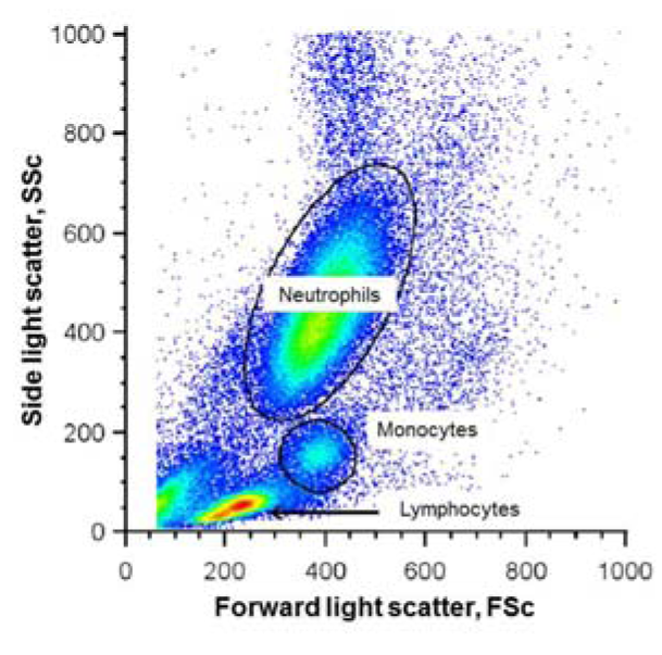 Les caractéristiques de la dispersion lumineuse frontale et latérale peuvent être utilisées pour identifier des cellules de type diffèrent grâce à leur taille et granularité. Dans l’exemple ci‐contre, neutrophiles, monocytes et populations lymphocytes sont différenciées sur base des caractéristiques de leur dispersion lumineuse. (Données fournies par Dr Jason Boland, University of Sheffield)