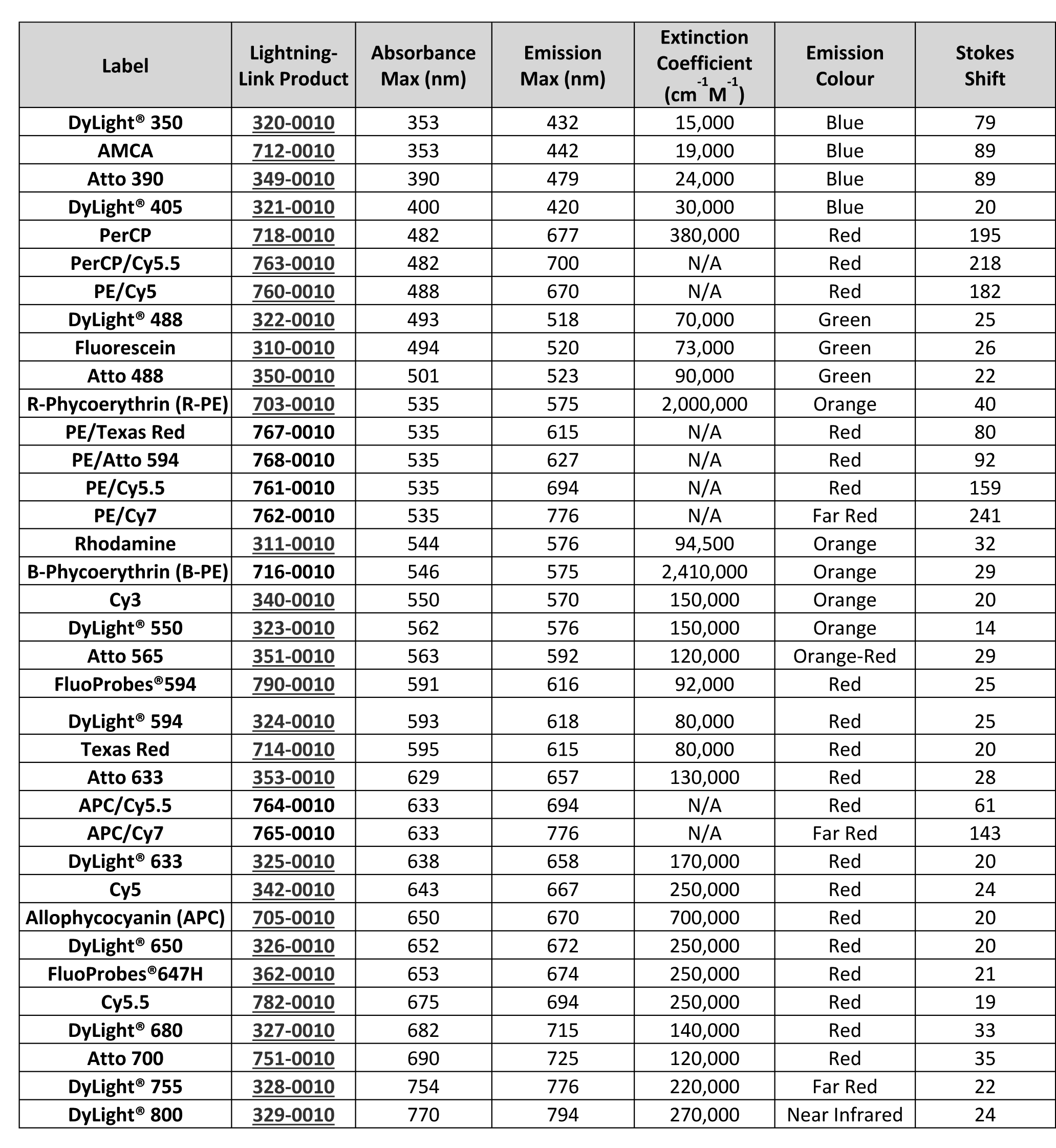 Ces kits de marquage d’anticorps simples d’utilisation sont particulièrement intéressants pour les utilisateurs de cytomètres en flux, étant donné que plus de 50 différents marqueurs sont disponibles, y compris des protéines fluorescentes, des fluorochromes et des tandems, qui, ensembles, couvrent la totalité du spectre lumineux, de l’UV à l’infrarouge.