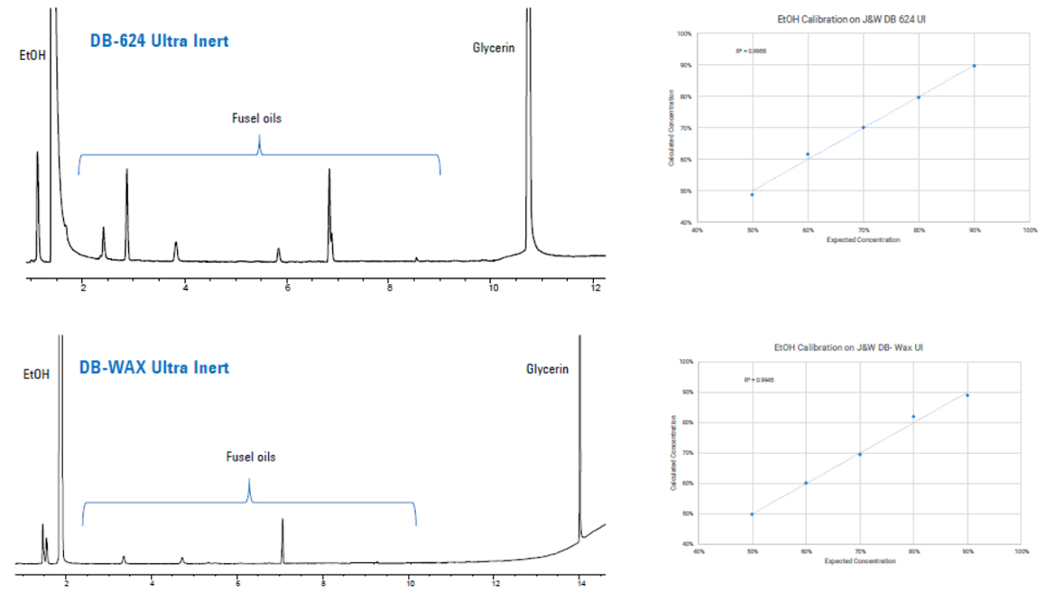 Figure 2. GC/FID chromatograms of an Ethanol hand sanitizer obtained from a distillery. The chromatograms were obtained using a DB-624 UI, 30 m x 0.32 mm id x 1.8 μm df (top) and DB-WAX UI, 30 m x 0.25 mm id x 0.25 μm df (bottom). Calibration curves were prepared for EtOH in a 50 to 90% v/v range. R2 were 0.995 and 0.994 for DB-624 UI and DB-WAX UI, respectively.