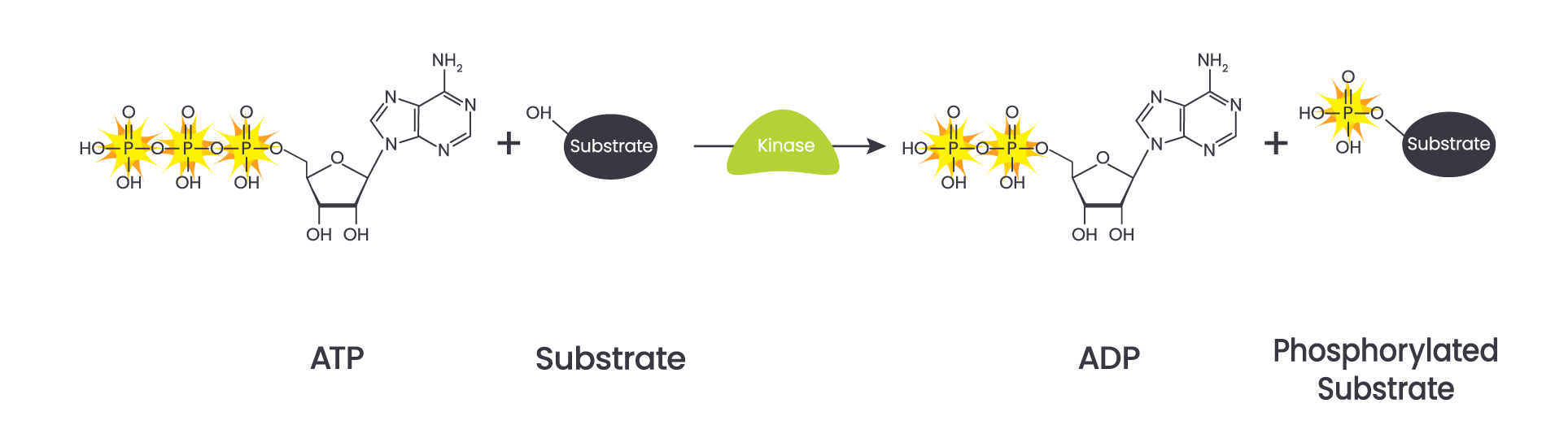 Les dosages basés sur la luminescence utilisent la luminescence liée à l’ADP pour mesurer l’activité kinase. Ils utilisent une réaction luciférase-luciférine pour détecter l’ATP nouvellement synthétisé. Ces tests sont très sensibles, à haut débit et peuvent être utilisés pour d’autres enzymes génératrices d’ADP.