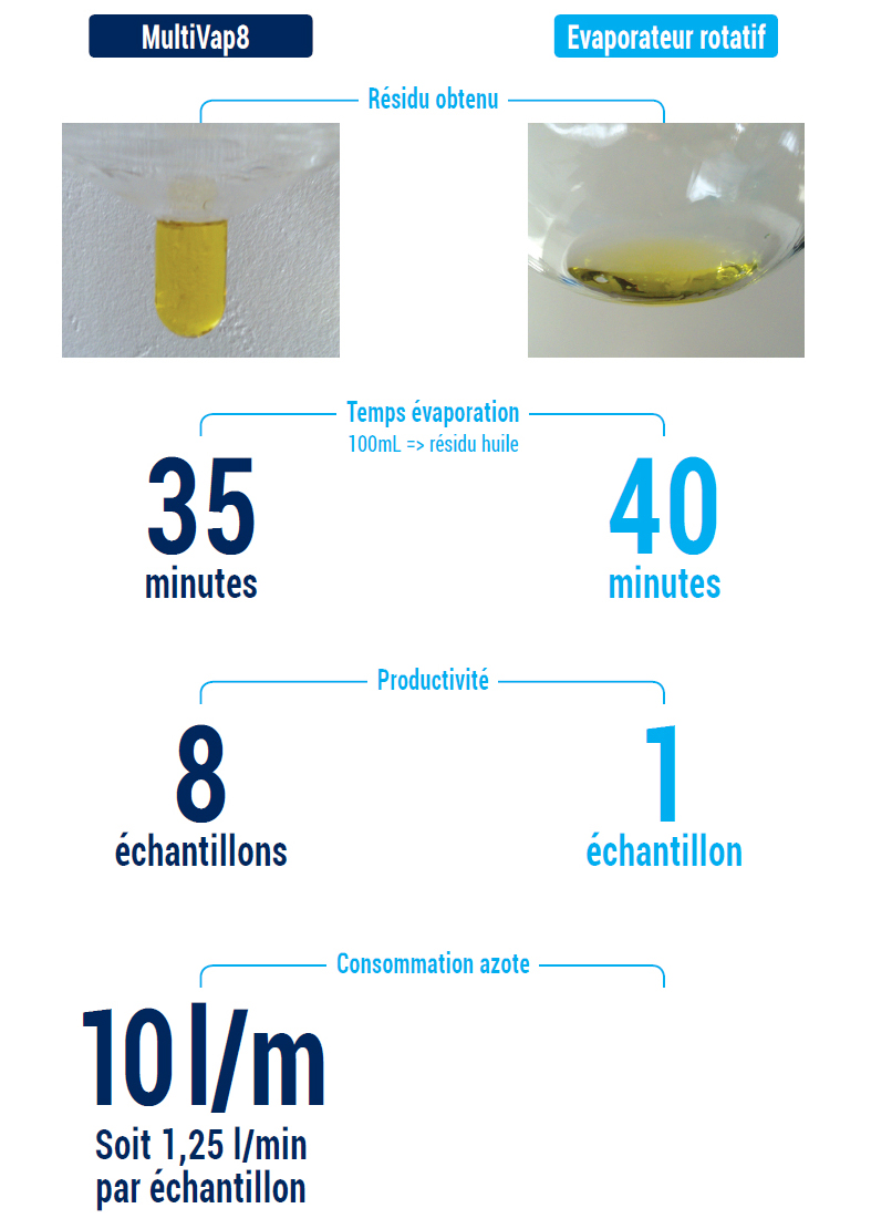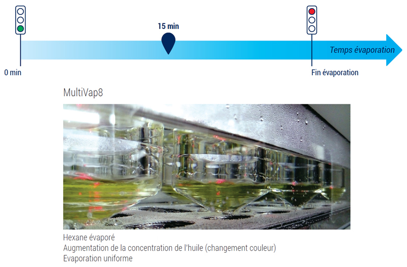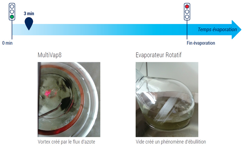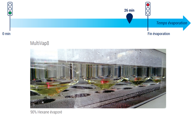 Le système MultiVap8 met en avant une vitesse d’évaporation plus rapide ainsi qu’une précision d’évaporation supérieure à celle de l’évaporateur rotatif.