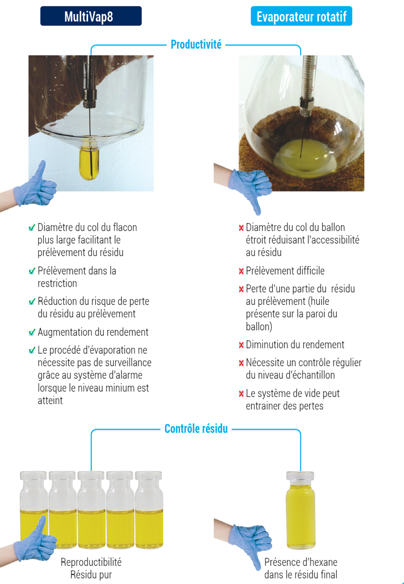L’évaporation sous vide est une technique utilisée pour évaporer ce type d’échantillon. Cependant l’évaporation d’un seul échantillon à la fois réduit fortement la cadence d’échantillonnage journalière. Un contrôle régulier de l’échantillon dans le ballon est nécessaire dans le cas d’une concentration jusqu’à 500uL ou 1ml avec le risque de perdre son extrait du à une évaporation à sec.