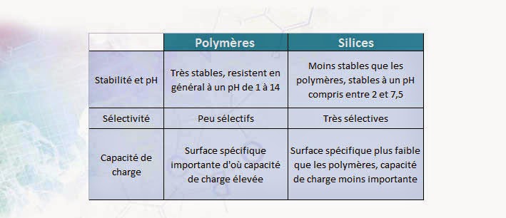 Ils sont faiblement sélectifs comparés aux silices greffées (exceptés les polymères échange d’ions).