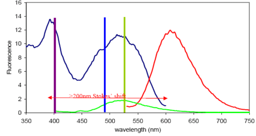 - Il présente alors un large décalage spectral, ce qui facilite la mesure du signal fluorescent.