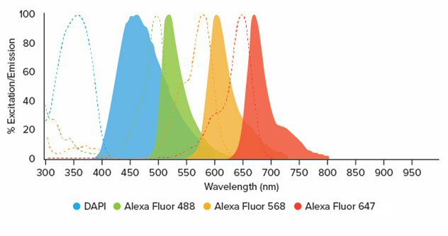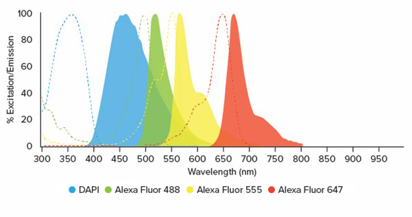 Les caractéristiques spectrales des trois Alexa Fluor® dans ce panel (Figure 1) permettent de les combiner avec le DAPI, un colorant nucléaire pour obtenir une immunofluorescence compatible à quatre couleurs (figure 2).