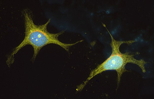Figure 2 : Immunomarquage indirect à quatre couleurs des cellules épithéliales humaines (HEp-2). La prolifération cellulaire est visualisée en vert, en utilisant un anticorps anti-Ki-67 de lapin suivi d’un anticorps d’âne anti-lapin conjugué à l’Alexa Fluor® 488 (711-545-152). Les microtubules sont visualisés en jaune, utilisant un anticorps anti-α tubuline de souris suivi d’un anticorps d’âne anti-souris IgG conjugué à l’Alexa Fluor® 555 (715-565-150). Les structures de l’appareil de Golgi sont visualisées en rouge, utilisant un anticorps anti-GM130/GOLGA2 humain de mouton, suivi d’un anticorps d’âne anti-mouton IgG conjugué à l’Alexa Fluor® 647 (713-605-147). La couleur bleue correspond au marquage nucléaire par le DAPI.