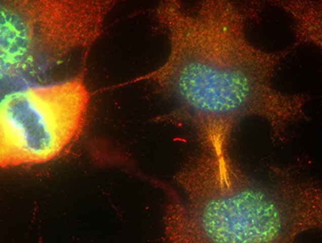 Figure 4 : Immunomarquage indirect à quatre couleurs de cellules épithéliales humaines (HEp-2). Prolifération cellulaire visualisée en vert, en utilisant l’anti-Ki-67 de lapin suivi de l’âne anti-lapin IgG (H+L) conjugué à l’Alexa Fluor® 488 (711-545-152). Les microtubules sont visualisés en jaune, à l’aide de l’anti-α-tubuline de souris suivi de l’anticorps d’âne anti-souris IgG (H+L) conjugué au Alexa Fluor® 568 (715-575-151). Le contact cellule-cellule est visualisé en rouge à l’aide de l’anti-E-Cadhérine de chèvre, suivi de l’anticorps d’âne anti-chèvre IgG (H+L) conjuguée à l’Alexa Fluor® 647 (705-605-147). La couleur bleue correspond au marquage nucléaire par le DAPI.