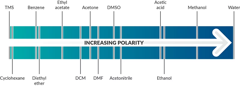 Une méthode de mesure de la polarité consiste à évaluer la constante diélectrique (ou permittivité relative), qui représente le facteur de réduction du champ électrique entre deux charges dans le matériau par rapport au vide. Plus la constante diélectrique est élevée, plus la polarité est importante. Ainsi, les solvants ayant une constante diélectrique inférieure à cinq sont considérés comme non polaires. Une autre approche plus directe pour mesurer la polarité est de quantifier le moment dipolaire, c’est-à-dire les charges partielles. Les solvants polaires présentent des moments dipolaires élevés en raison des liaisons entre des atomes ayant des électronégativités différentes. En revanche, les solvants non polaires ne possèdent que peu ou pas de charges partielles et donc un faible ou nul moment dipolaire.